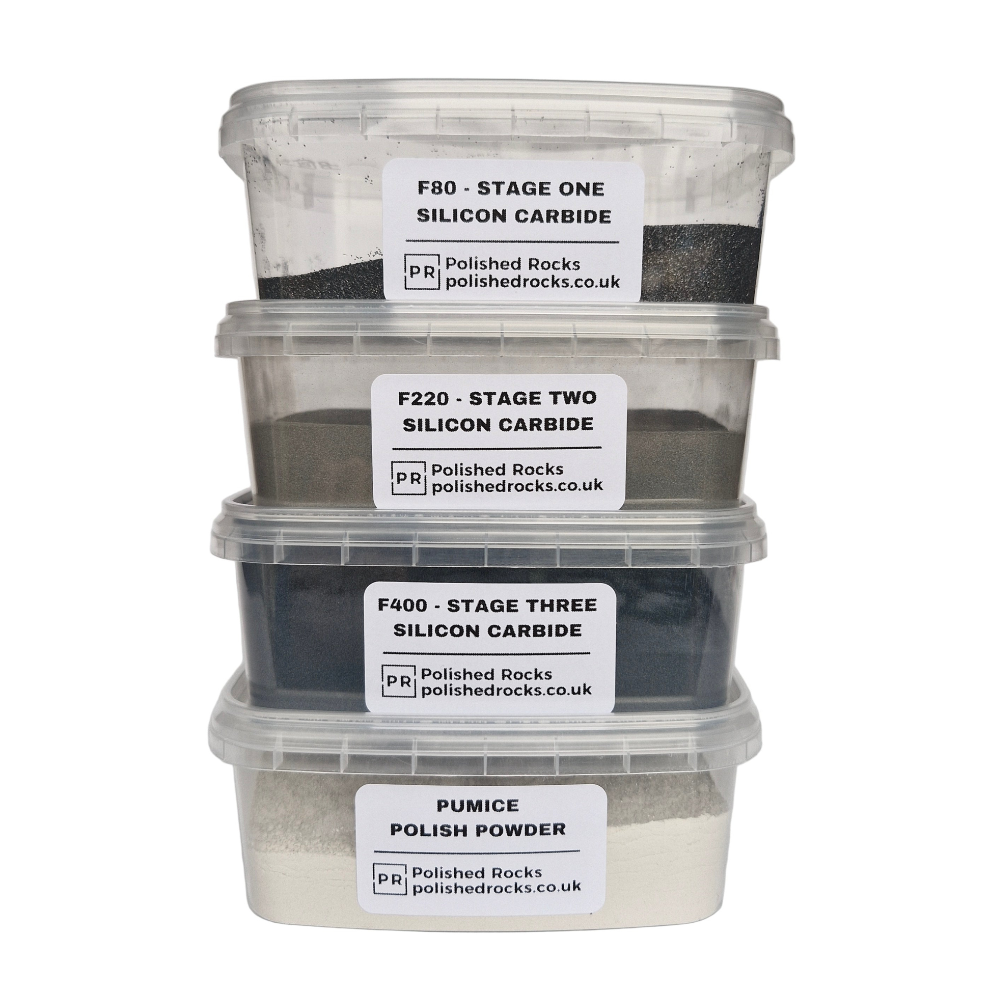 Our beginner grit pack is everything you need for several tumble loads. This is a low cost option to get started and comes in resealable tubs. This pack contains one tub each of – F80 Course Grit [200g], F220 Medium Grit [200g], F400 Fine Grit [200g] and Pumice Polish Powder [100g].
